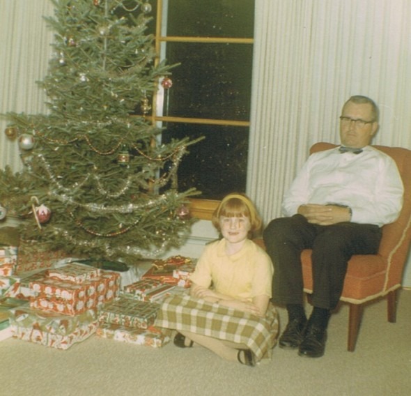 When I was a little girl, we lived in a colonial (a house with an upstairs, main floor, and basement). My grandpa had died when I was three, so my grandma came to live with us for a while. (This is a photo of that house with my dad. I was probably six or seven that Christmas.) My Christmas memories are sketchy as a child, and the pictures are in my memory rather than actual photos, but I recall family gatherings, always centered around the dinner table where dessert was my highlight! We had “eight-layer cake,” which was really a torte made with Cadbury chocolate (oh yum!), and my grandmother’s fruit cake, which was better than any fruit cake I have ever tasted since. (My grandma knew how to cook and bake and she loved to entertain! I did not inherit that gene, and am very grateful that Randy bakes our Christmas cookies. No one bakes her fruit cake anymore, but someday maybe I’ll talk some family members into helping me make that eight-layer cake again.)