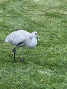 I’m looking out my window at our resident family of sandhill cranes. They travel as a family until the colt (child) is able to be on its own. We’ve watched the colt grow from tiny in the spring until nearly full grown in the fall. Recently, the teenager got his/her leg caught in fishing wire and a lure last week. We worried that it wouldn’t survive. When it showed up in our yard, I felt so bad for the creature that I prayed that God would help it. A few moments later the doorbell rang. Neighbors who heard that the crane was in our yard came by asking to help. They caught the crane in a blanket and held it against our fence while the other one cut the wire. It was free! It still limps, but I see improvement each day. God answered that prayer quickly!